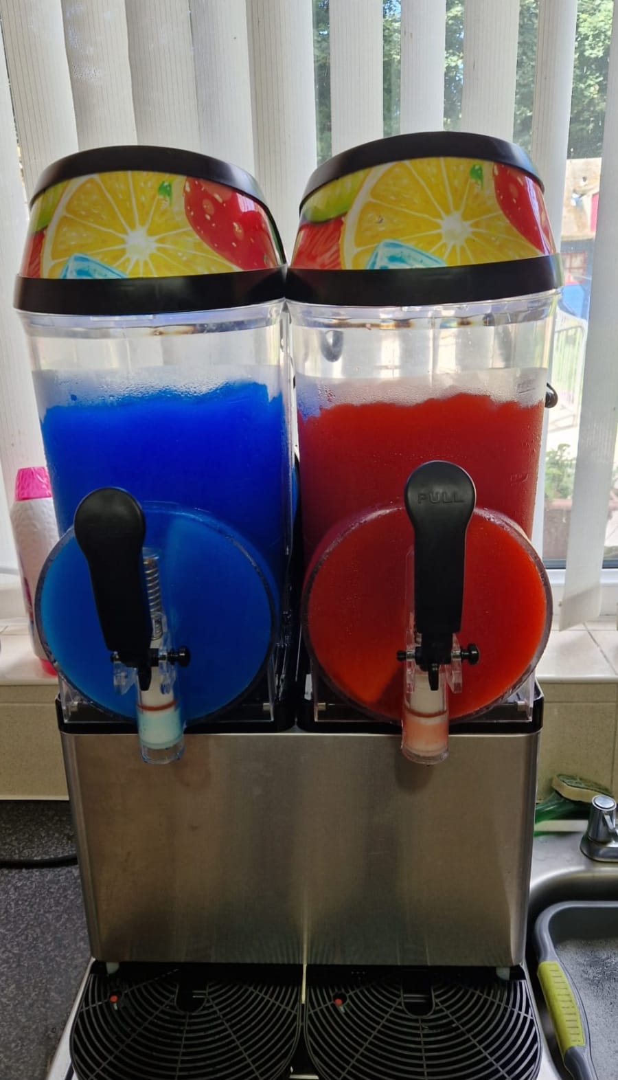 We will supply the syrup, fill both tanks with different flavour slush (Strawberry and Blue Raspberry) and provide the cups and straws for you to use.
